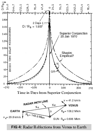 Light travels more slowly at lower levels in a gravitational field according to the extended Newtonian physics. So it takes slightly longer for a beam to travel from one planet to another if the light passes close to the Sun than for the same distance free from the sun's influence. This is the "Shapiro time delay". Again the predictions agree well with observations made during the space exploits to Mars using data reproduced by will (124). A comparison with other theories is given in FIG.10*